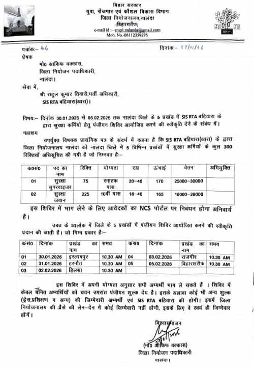 जो उम्मीदवार Bihar Security Guard & Supervisor Vacancy 2026 के लिए आवेदन करना चाहते हैं, उन्हें रोजगार मेला में शामिल होना होगा।