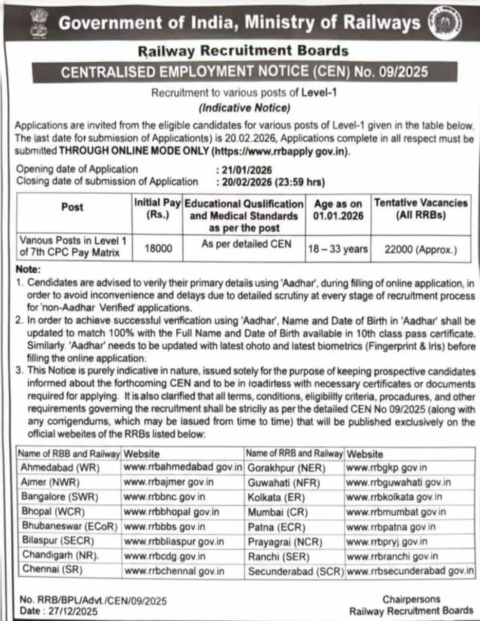 RRB Group D Vacancy 2026 तो हमारे इस आर्टिकल के अंत तक पढ़े इस आर्टिकल में हम आपको पूरी जानकारी विस्तार में बताएंगे की इस भर्ती के अंतर्गत किस तरह से आवेदन कर सकते हैं आवेदन करने के लिए क्या-क्या आवश्यक है दस्तावेज लगने वाले हैं जिसकी पूरी जानकारी विस्तार में बताएंगे। इस आर्टिकल के अंत में हम आप सभी को डायरेक्ट लिंक उपलब्ध कराएंगे ताकि आप इस आर्टिकल का लाभ पूरा पूरा ले सकें।